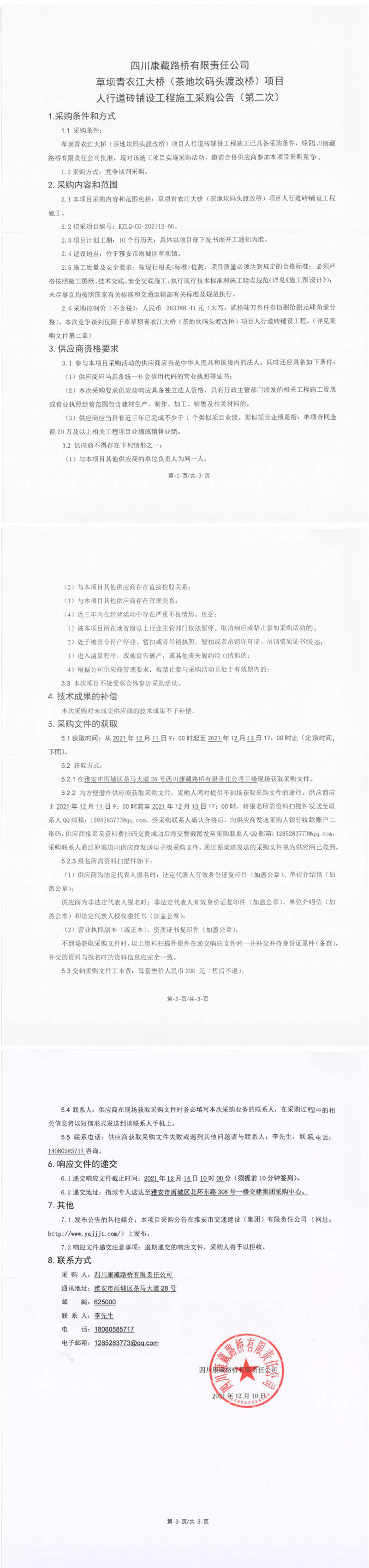 四川康藏路橋有限責(zé)任公司草壩青衣江大橋(茶地坎碼頭渡改橋)項(xiàng)目人行道磚鋪設(shè)工程施工采購公告(第二次)