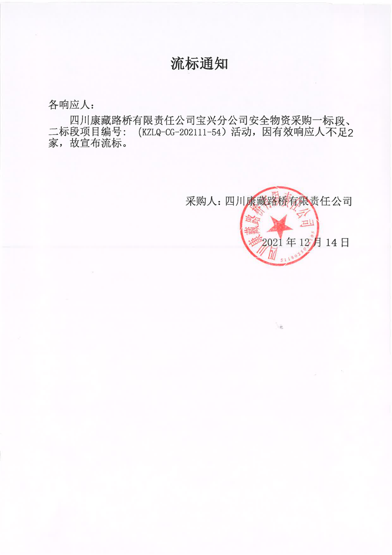 四川康藏路橋有限責(zé)任公司寶興分公司安全物資采購一標(biāo)段、二標(biāo)段項目流標(biāo)通知