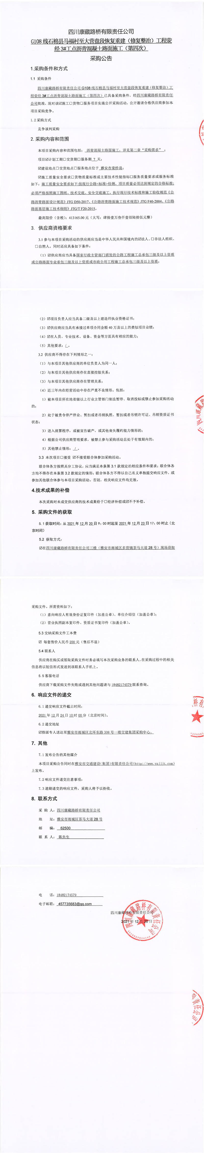 四川康藏路橋有限責(zé)任公司G108線石棉縣馬福村至大營盤段恢復(fù)重建(修復(fù)整治)工程滎經(jīng)3#工點(diǎn)瀝青混凝土路面施工(第四次)采購公告