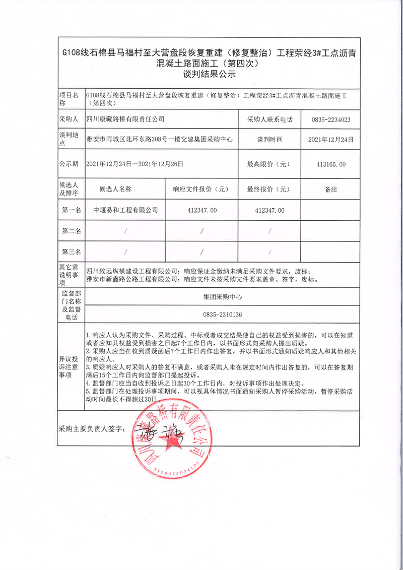 四川康藏路橋有限責(zé)任公司G108線石棉縣馬福村至大營盤段恢復(fù)重建(修復(fù)整治)工程滎經(jīng)3#工點(diǎn)瀝青混凝土路面施工(第四次)談判結(jié)果公示
