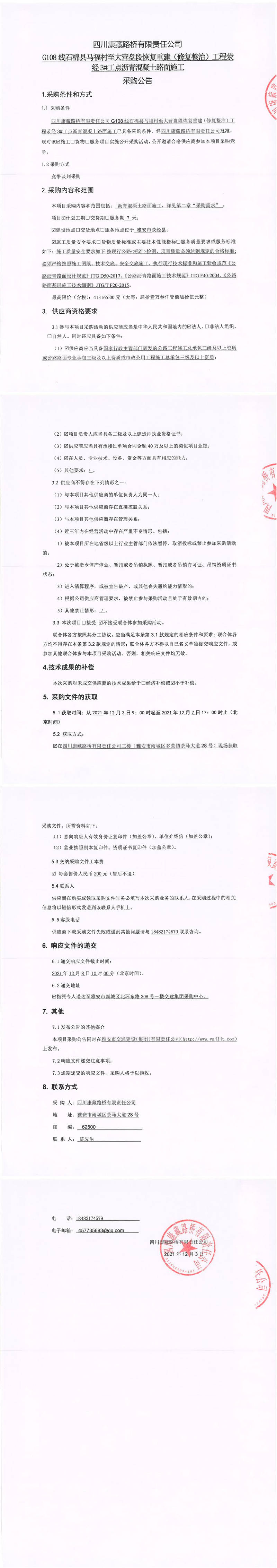 四川康藏路橋有限責(zé)任公司G108線石棉縣馬福村至大營盤段恢復(fù)重建(修復(fù)整治)工程滎經(jīng)3#工點(diǎn)瀝青混凝土路面施工采購公告