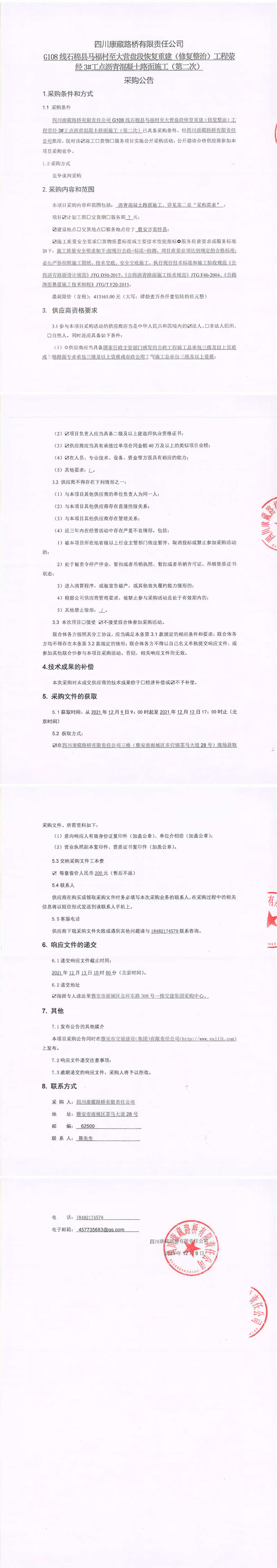 四川康藏路橋有限責(zé)任公司G108線石棉縣馬福村至大營盤段恢復(fù)重建(修復(fù)整治)工程滎經(jīng)3#工點瀝青混凝土路面施工(第二次)采購公告