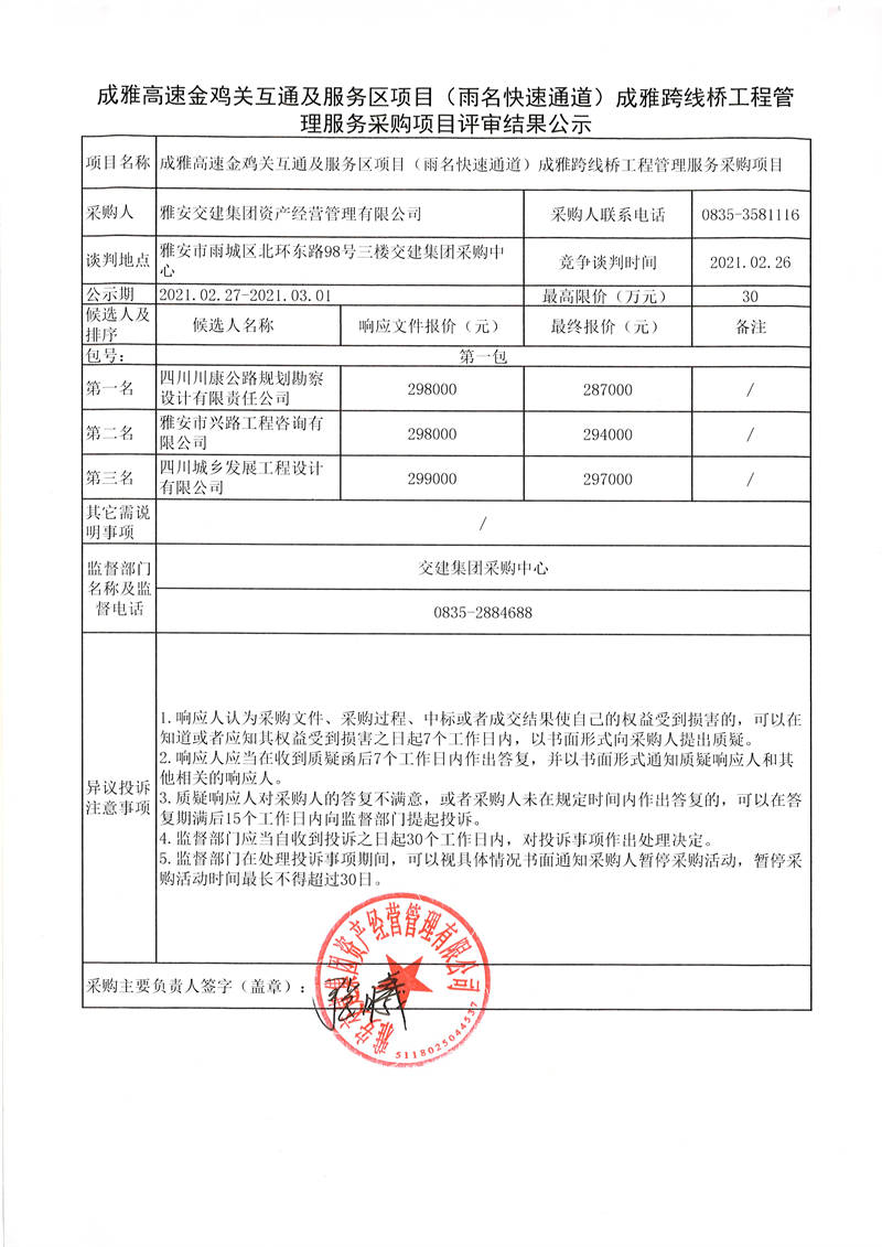 雅安交建集團資產(chǎn)經(jīng)營管理有限公司成雅高速金雞關(guān)互通及服務(wù)區(qū)項目(雨名快速通道)成雅跨線橋工程管理服務(wù)采購項目評審結(jié)果公示