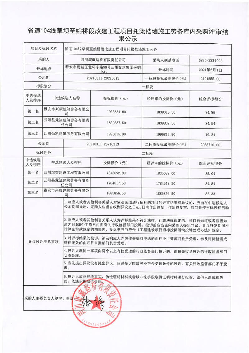 四川康藏路橋有限責任公司省道104線草壩至姚橋段改建工程項目托梁擋墻施工勞務庫內采購評審結果公示