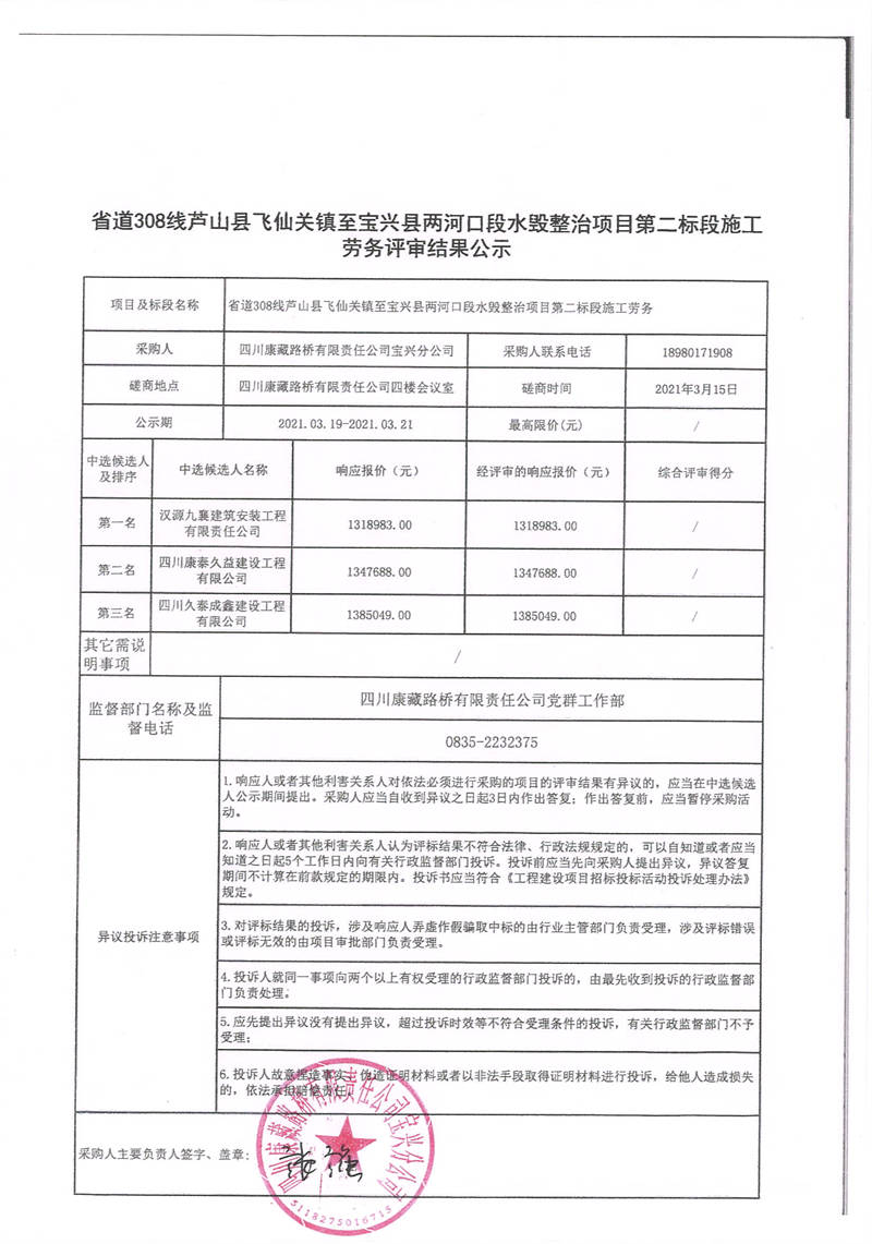四川康藏路橋有限責任公司寶興分公司省道308線蘆山縣飛仙關(guān)鎮(zhèn)至寶興縣兩河口段水毀整治項目第二標段施工勞務(wù)評審結(jié)果公示