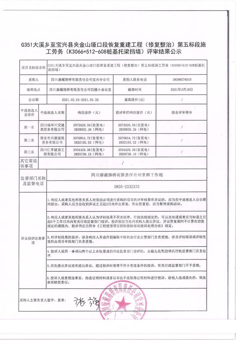 四川康藏路橋有限責(zé)任公司寶興分公司G351大溪鄉(xiāng)至寶興縣夾金山埡口段恢復(fù)重建工程(修復(fù)整治)第五標(biāo)段施工勞務(wù)(k3066+512-608樁基托梁擋墻)評(píng)審結(jié)果公示