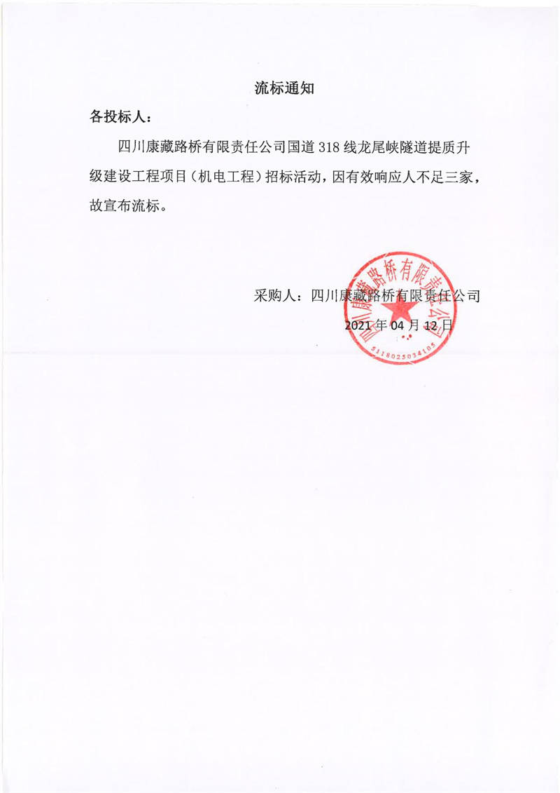 四川康藏路橋有限責(zé)任公司國(guó)道318線龍尾峽隧道提質(zhì)升級(jí)建設(shè)工程項(xiàng)目(機(jī)電工程)流標(biāo)通知