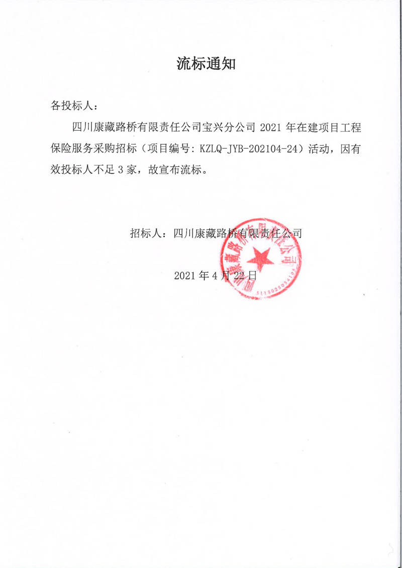 四川康藏路橋有限責(zé)任公司寶興分公司2021年在建項目工程保險服務(wù)采購流標通知