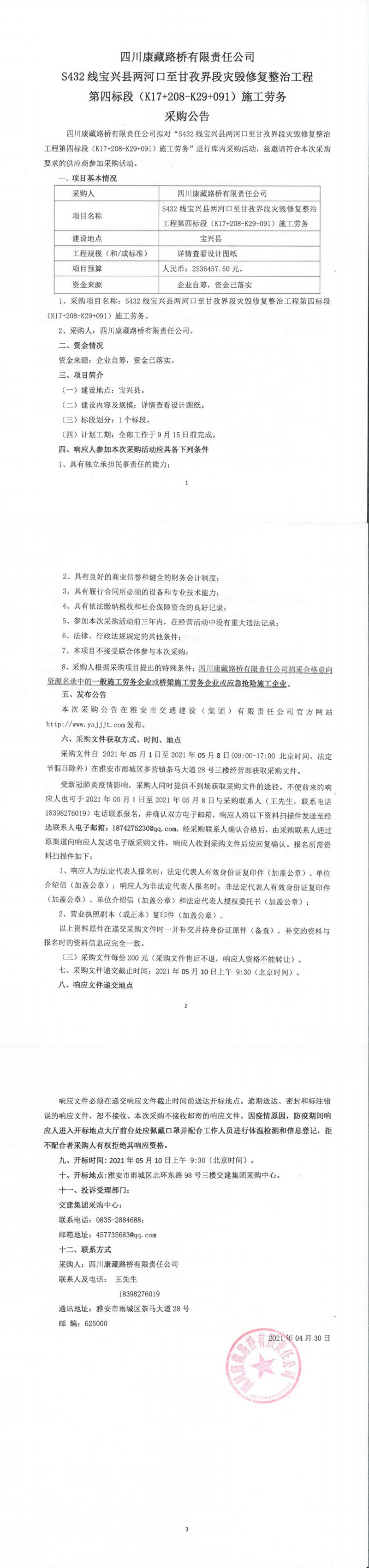 四川康藏路橋有限責(zé)任公司S432線寶興縣兩河口至甘孜界段災(zāi)毀修復(fù)整治工程第四標(biāo)段(K17+208-K29+091)施工勞務(wù)采購(gòu)公告