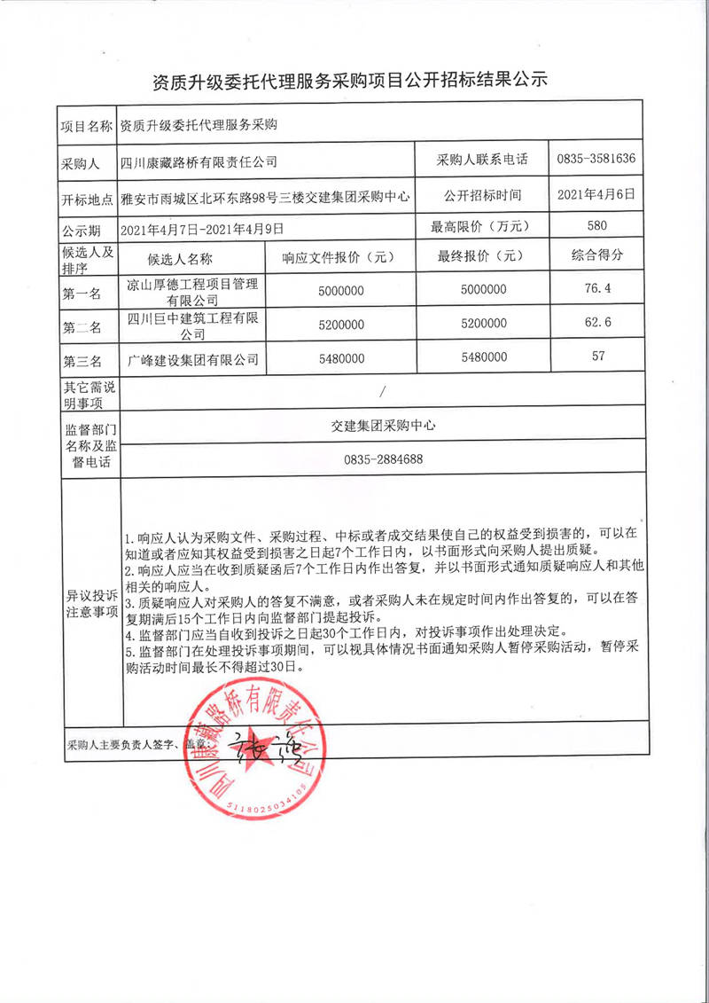 四川康藏路橋有限責任公司資質(zhì)升級委托代理服務采購項目公開招標結果公示