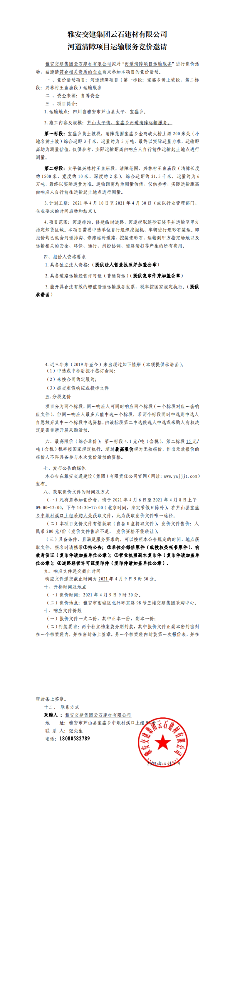 雅安交建集團(tuán)云石建材有限公司河道清障項目運輸服務(wù)競價公告