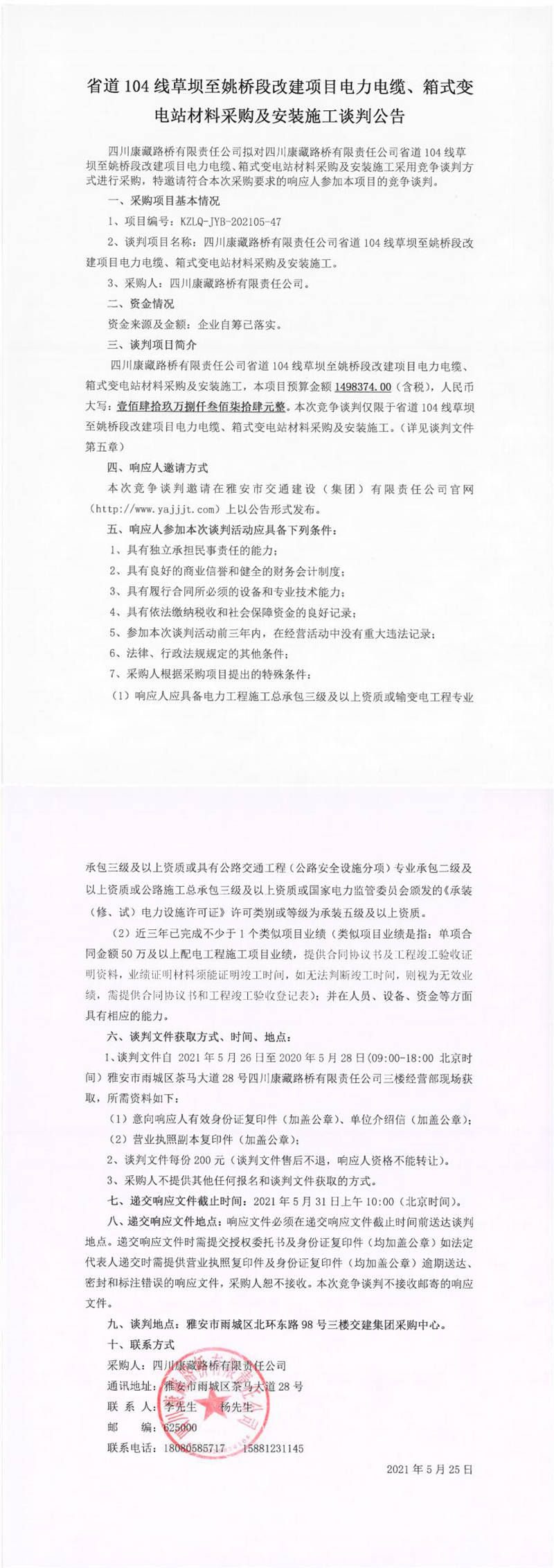 四川康藏路橋有限責(zé)任公司省道104線(xiàn)草壩至姚橋段改建項(xiàng)目電力電纜、箱式變電站材料采購(gòu)及安裝施工談判公告