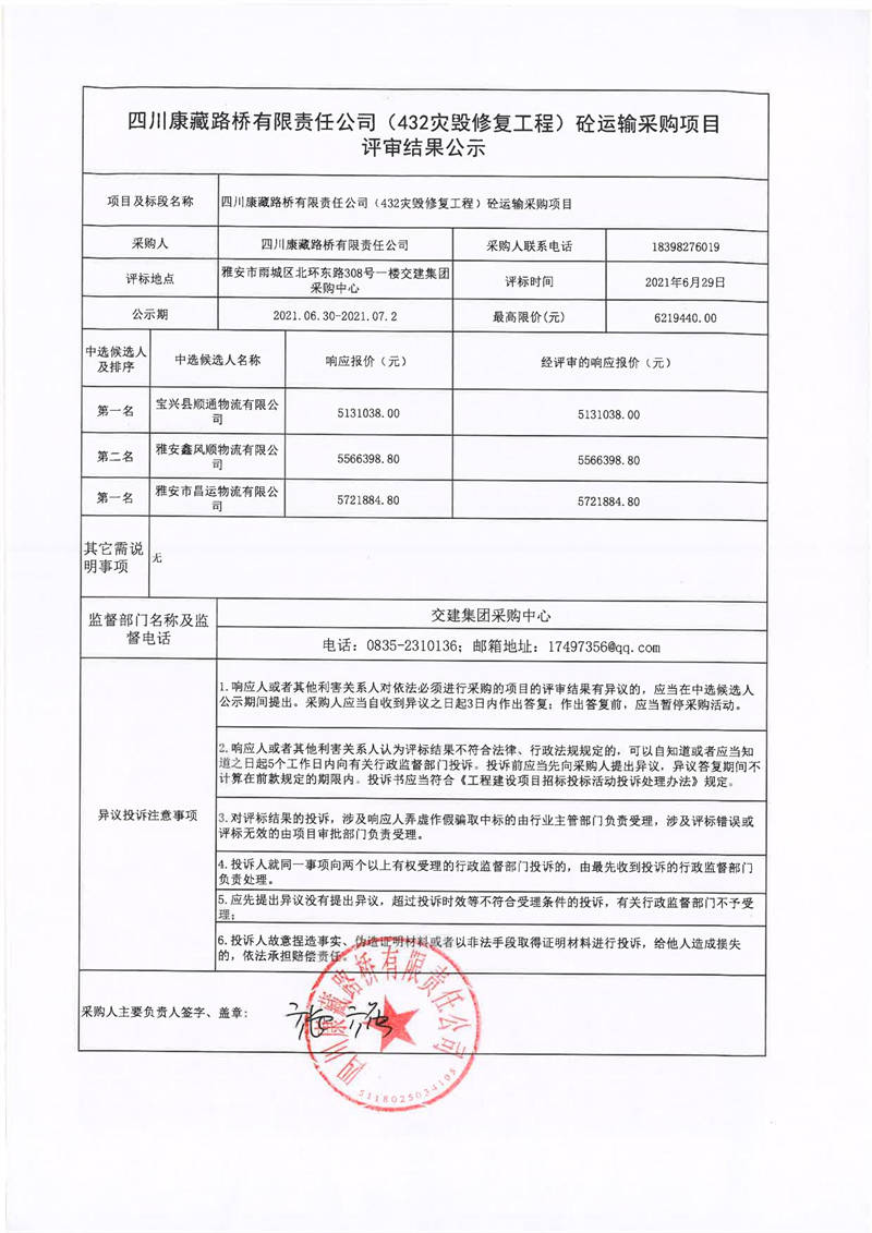 四川康藏路橋有限責(zé)任公司S432線寶興縣兩河口至甘孜界段災(zāi)毀修復(fù)整治工程砼運(yùn)輸采購項目評審結(jié)果公示