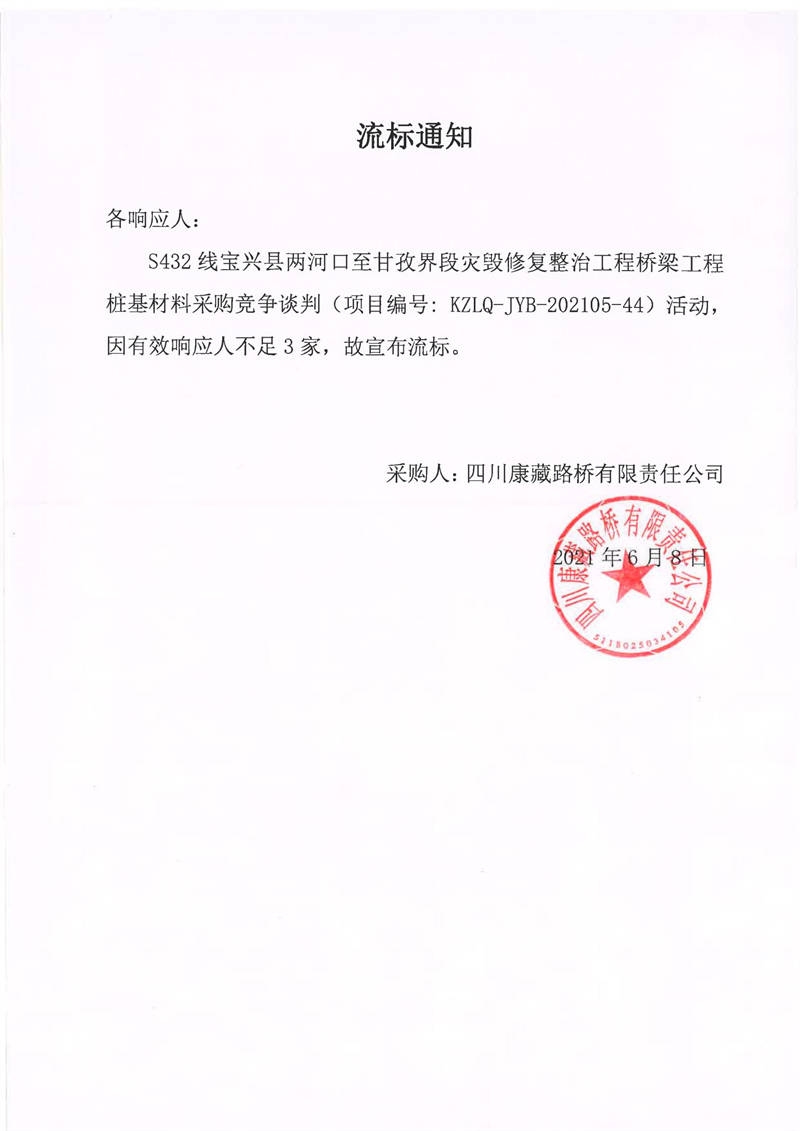 四川康藏路橋有限責任公司S432線寶興縣兩河口至甘孜界段災毀修復整治工程橋梁工程樁基材料采購競爭談判流標通知