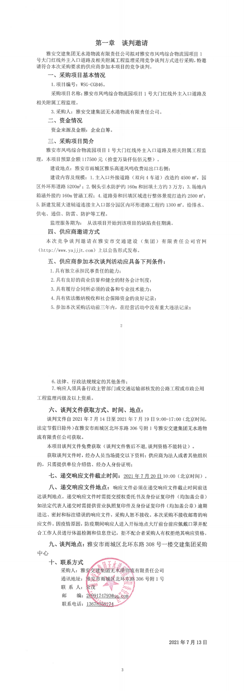 雅安交建集團(tuán)無水港物流有限責(zé)任公司雅安市鳳鳴綜合物流園項(xiàng)目1號(hào)大門紅線外主入口道路及相關(guān)附屬工程監(jiān)理競(jìng)爭(zhēng)談判公告