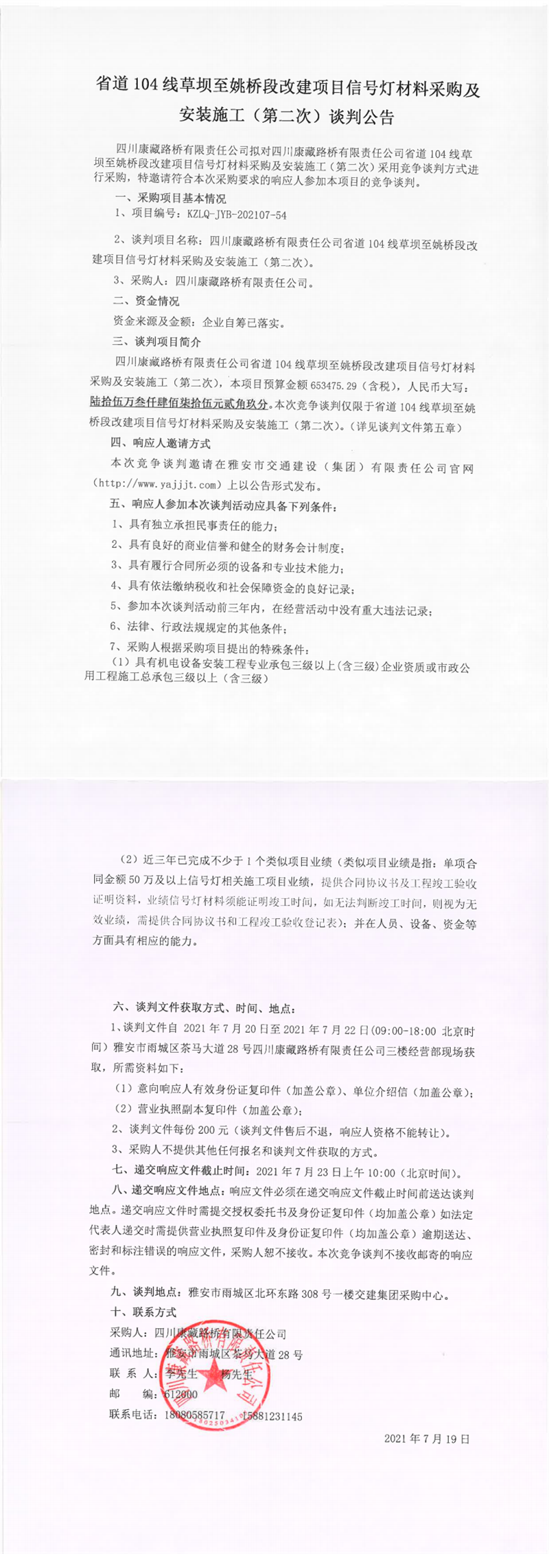 四川康藏路橋有限責(zé)任公司省道104線草壩至姚橋段改建項(xiàng)目信號燈材料采購及安裝施工(第二次)談判公告