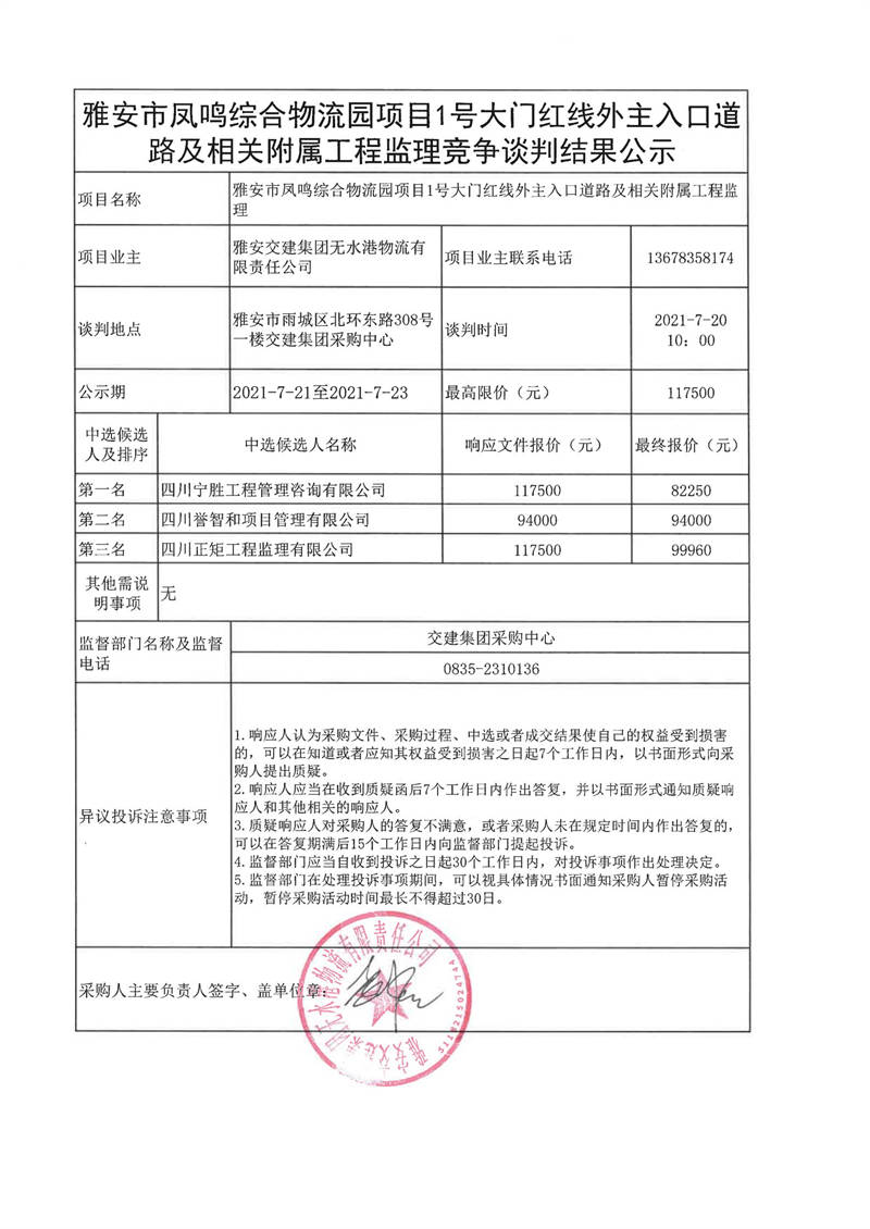 雅安交建集團(tuán)無水港物流有限責(zé)任公司雅安市鳳鳴綜合物流園項(xiàng)目1號大門紅線外主入口道路及相關(guān)附屬工程監(jiān)理競爭談判結(jié)果公示