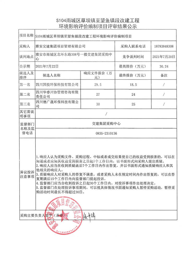 雅安交建集團項目管理有限公司S104雨城區(qū)草壩鎮(zhèn)至望魚鎮(zhèn)段改建工程水土保持方案編制服務項目評審結果公示