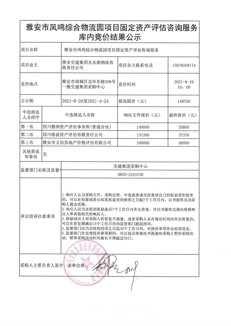 雅安交建集團(tuán)無(wú)水港物流有限責(zé)任公司雅安市鳳鳴綜合物流園項(xiàng)目固定資產(chǎn)評(píng)估咨詢服務(wù)庫(kù)內(nèi)競(jìng)價(jià)結(jié)果公示