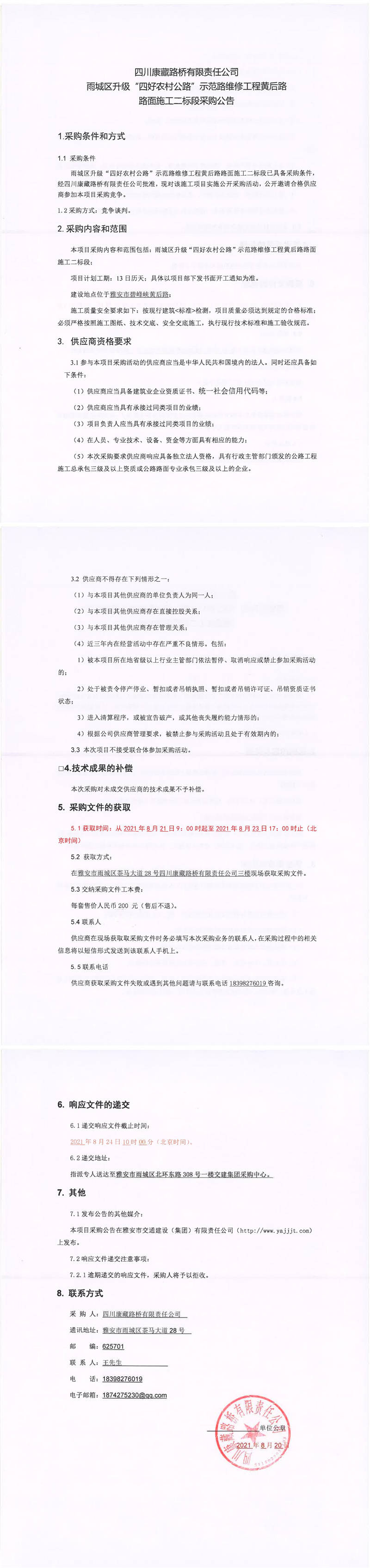 四川康藏路橋有限責(zé)任公司雨城區(qū)升級(jí)“四好農(nóng)村公路”示范路維修工程黃后路路面施工二標(biāo)段采購公告