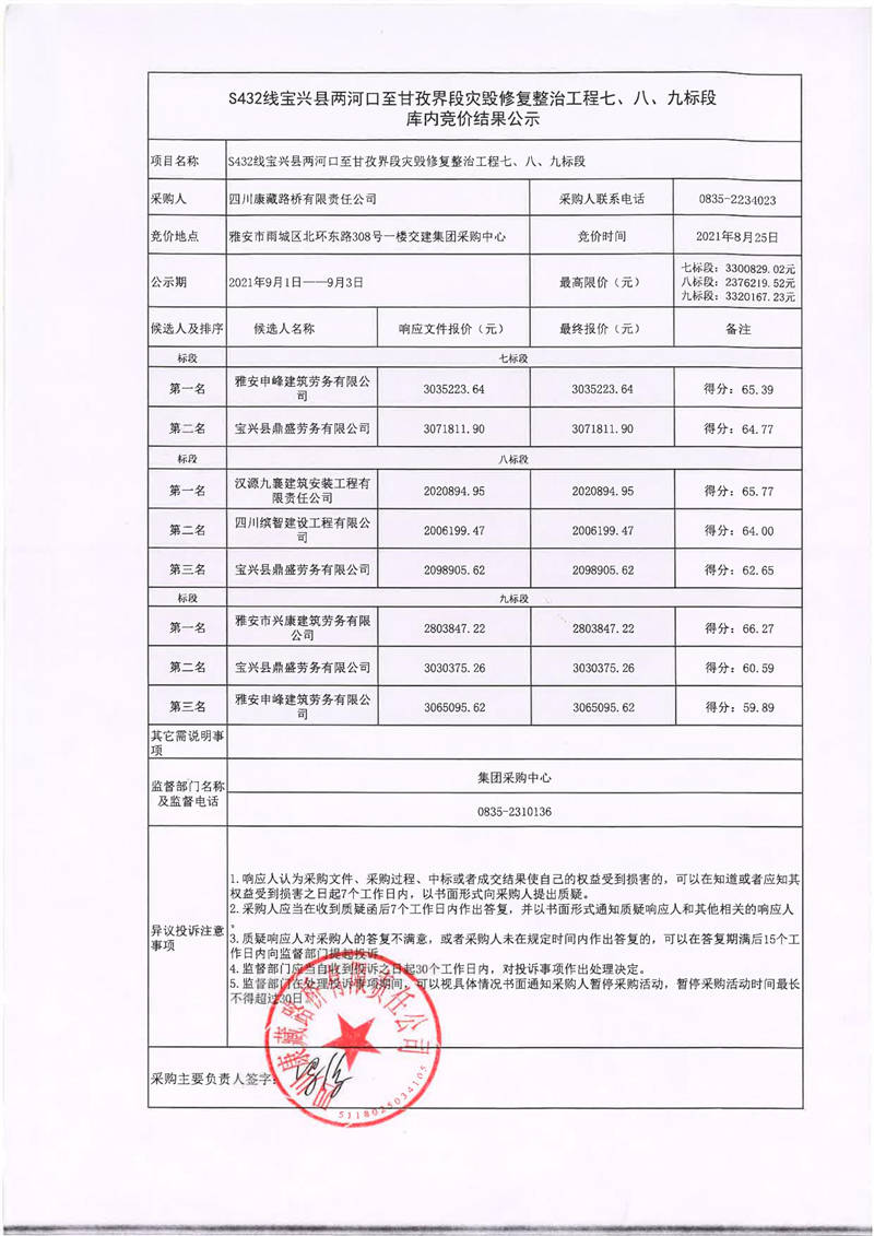 四川康藏路橋有限責(zé)任公司S432線寶興縣兩河口至甘孜界段災(zāi)毀修復(fù)整治工程七、八、九標(biāo)段庫(kù)內(nèi)競(jìng)價(jià)結(jié)果公示