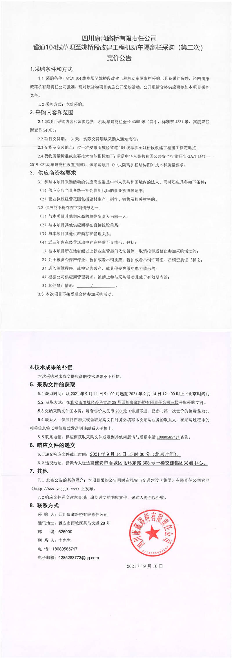 四川康藏路橋有限責(zé)任公司省道104線草壩至姚橋段改建工程機(jī)動(dòng)車隔離欄采購(第二次)競價(jià)公告