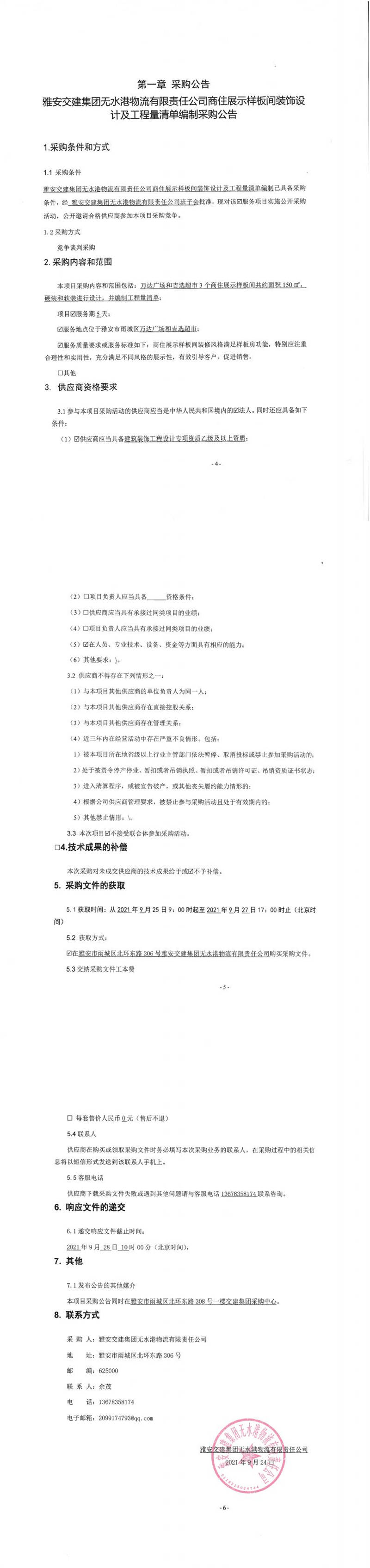 雅安交建集團無水港物流有限責任公司商住展示樣板間裝飾設(shè)計及工程量清單編制采購公告