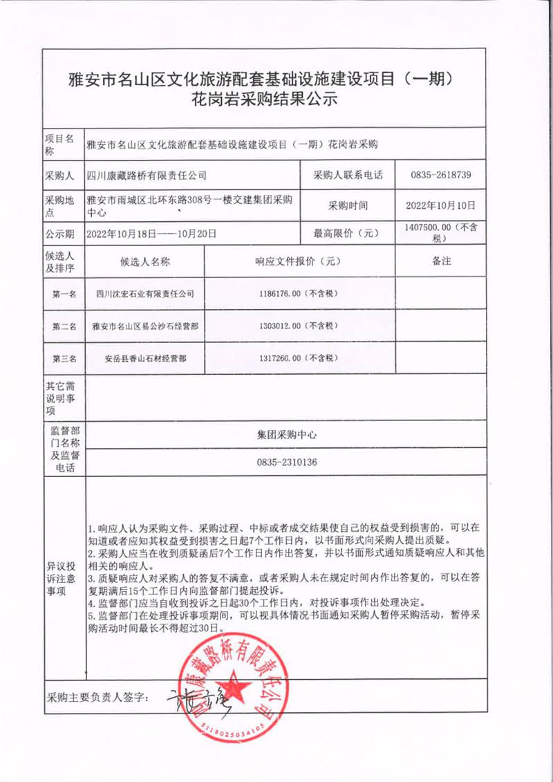 四川康藏路橋有限責任公司雅安市名山區(qū)文化旅游配套基礎(chǔ)設施建設項目(一期)花崗巖采購結(jié)果公示