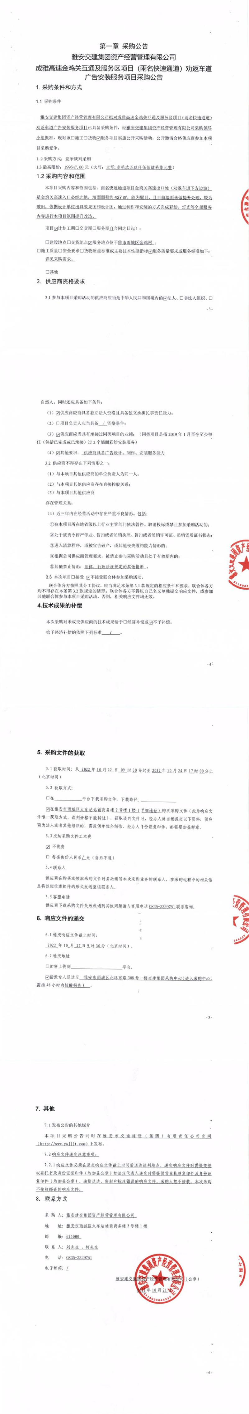 雅安交建集團(tuán)資產(chǎn)經(jīng)營(yíng)管理有限公司成雅高速金雞關(guān)互通及服務(wù)區(qū)項(xiàng)目(雨名快速通道)勸返車(chē)道廣告安裝服務(wù)項(xiàng)目采購(gòu)公告