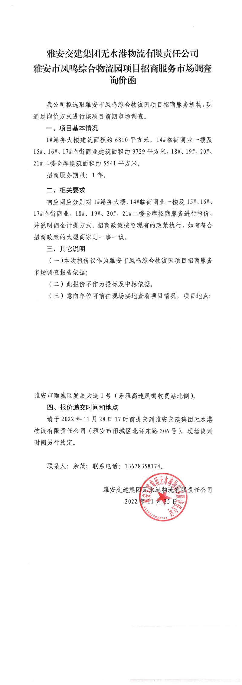 雅安交建集團(tuán)無水港物流有限責(zé)任公司雅安市鳳鳴綜合物流園項(xiàng)目招商服務(wù)市場(chǎng)調(diào)查詢價(jià)函