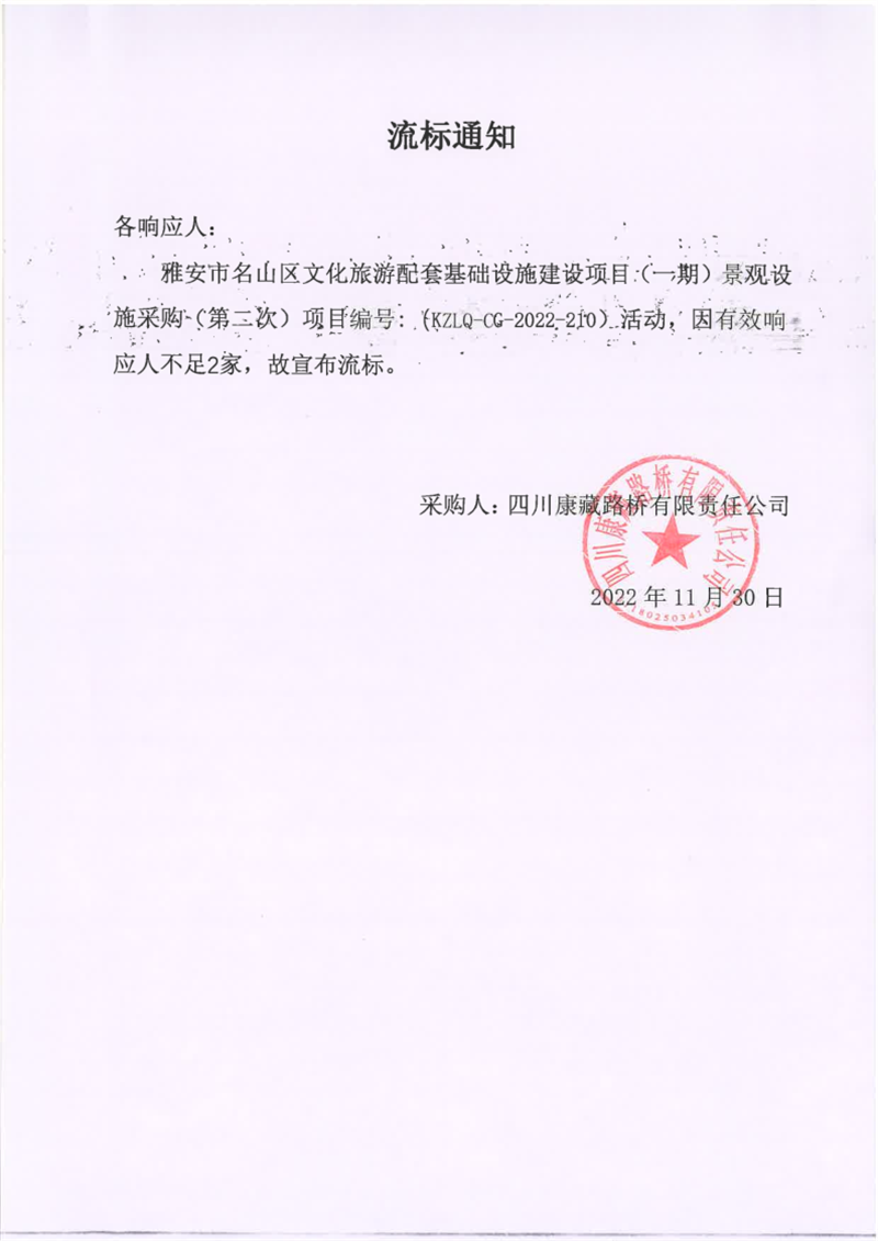 四川康藏路橋有限責(zé)任公司雅安市名山區(qū)文化旅游配套基礎(chǔ)設(shè)施建設(shè)項(xiàng)目(一期)景觀(guān)設(shè)施采購(gòu)(第二次)流標(biāo)通知
