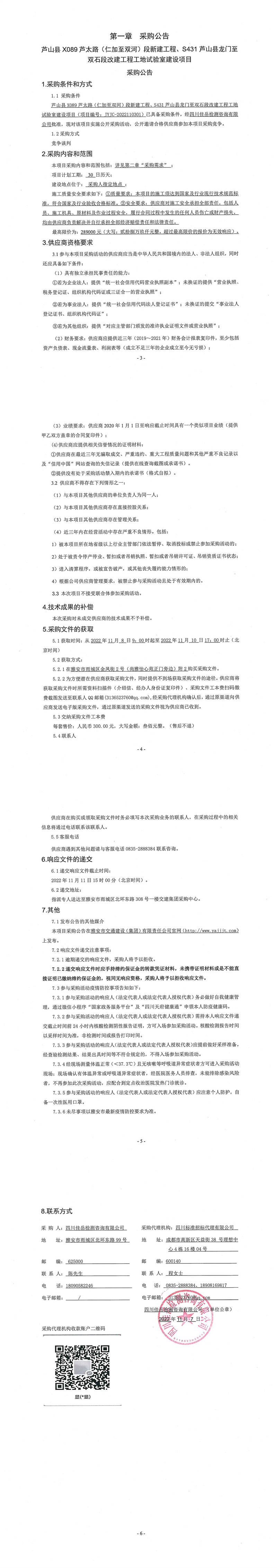 四川佳岳檢測咨詢有限公司蘆山縣X089蘆太路(仁加至雙河)段新建工程、S431蘆山縣龍門至雙石段改建工程工地試驗(yàn)室建設(shè)項(xiàng)目采購公告