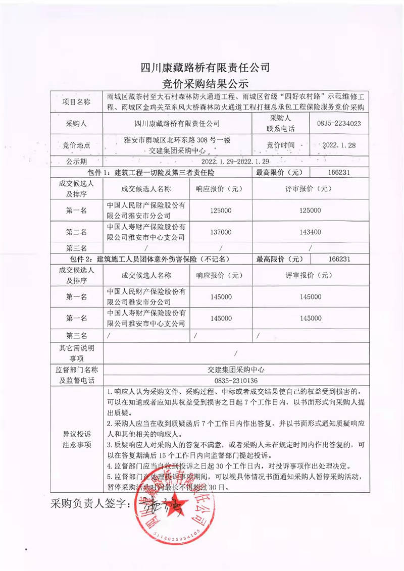 四川康藏路橋有限責(zé)任公司雨城區(qū)藏茶村至大石村森林防火通道工程、雨城區(qū)省級(jí)“四好農(nóng)村路”示范維修工程、雨城區(qū)金雞關(guān)至東風(fēng)大橋森林防火通道工程打捆總承包工程保險(xiǎn)服務(wù)競價(jià)采購結(jié)果公示