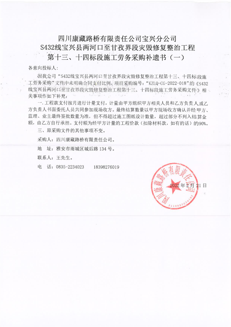 四川康藏路橋有限責(zé)任公司寶興分公司S432線(xiàn)寶興縣兩河口至甘孜界段災(zāi)毀修復(fù)整治工程第十三、十四標(biāo)段施工勞務(wù)采購(gòu)補(bǔ)遺書(shū)(一)