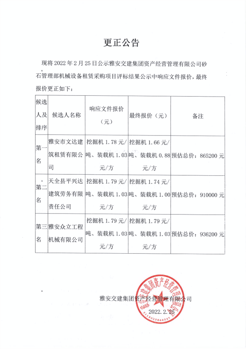 雅安交建集團(tuán)資產(chǎn)經(jīng)營管理有限公司砂石管理部機(jī)械設(shè)備租賃采購項(xiàng)目評標(biāo)結(jié)果公示更正公告