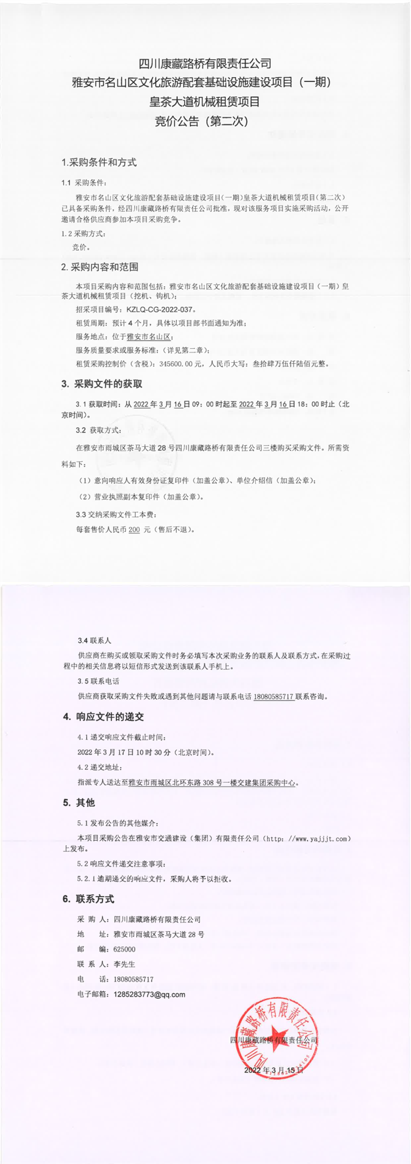 四川康藏路橋有限責(zé)任公司雅安市名山區(qū)文化旅游配套基礎(chǔ)設(shè)施建設(shè)項(xiàng)目(一期)皇茶大道機(jī)械租賃項(xiàng)目競價(jià)公告(第二次)