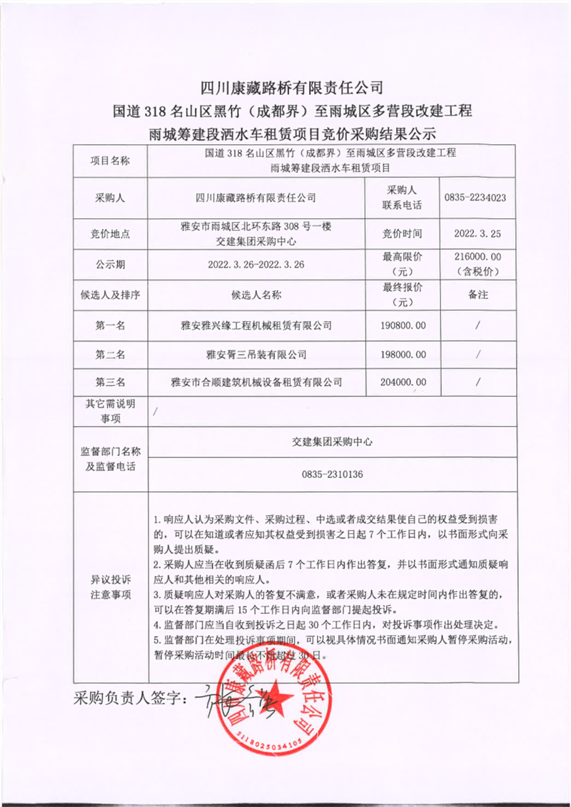 四川康藏路橋有限責(zé)任公司國(guó)道318名山區(qū)黑竹(成都界)至雨城區(qū)多營(yíng)段改建工程雨城籌建段灑水車(chē)租賃項(xiàng)目競(jìng)價(jià)采購(gòu)結(jié)果公示