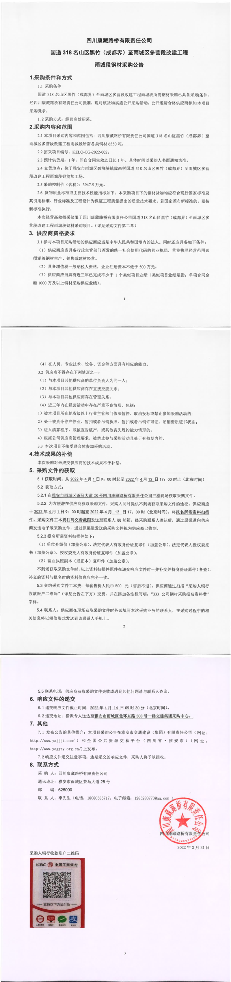 四川康藏路橋有限責任公司國道318名山區(qū)黑竹(成都界)至雨城區(qū)多營段改建工程雨城段鋼材采購公告