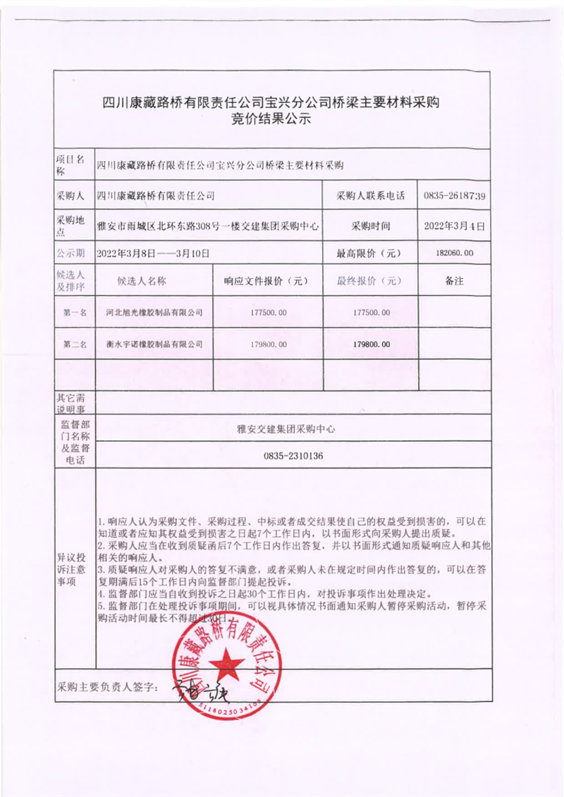 四川康藏路橋有限責任公司寶興分公司橋梁主要材料采購競價結(jié)果公示