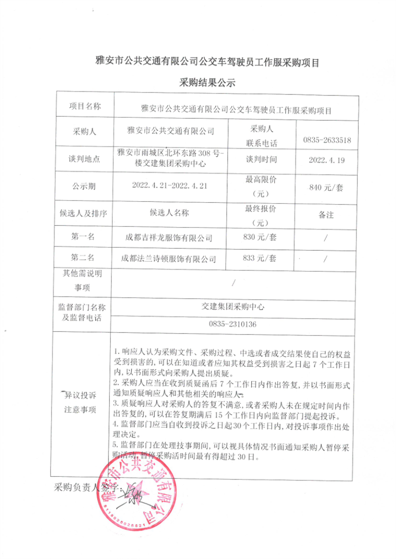 雅安市公共交通有限公司公交車駕駛員工作服采購項目采購結(jié)果公示