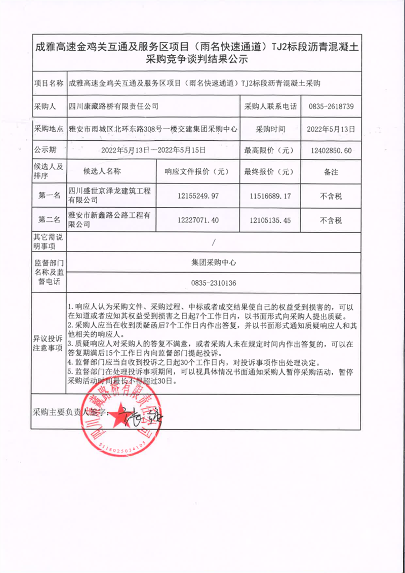 四川康藏路橋有限責(zé)任公司成雅高速金雞關(guān)互通及服務(wù)區(qū)項目(雨名快速通道)TJ2標(biāo)段瀝青混凝土采購競爭談判結(jié)果公示