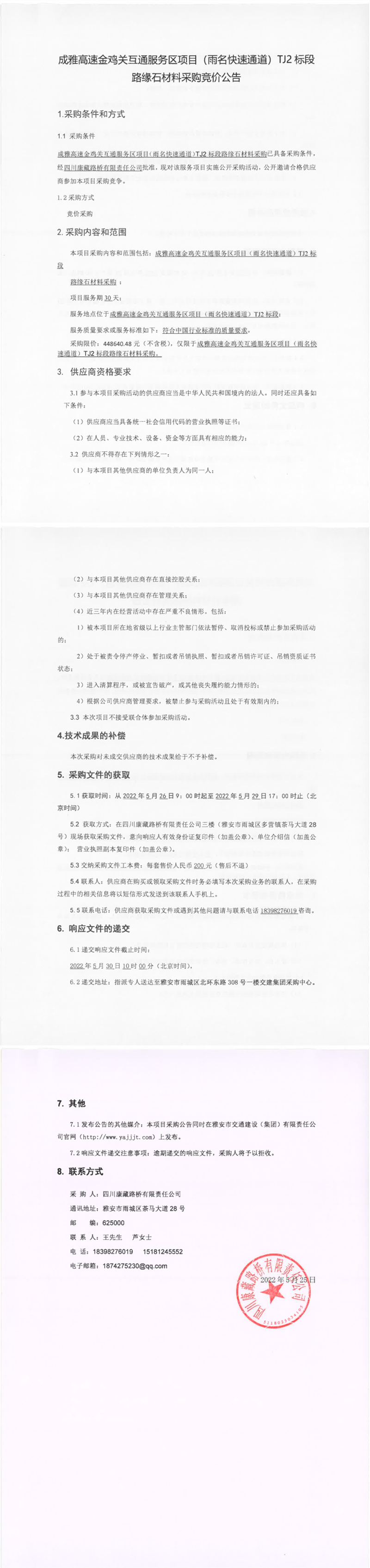 四川康藏路橋有限責(zé)任公司成雅高速金雞關(guān)互通服務(wù)區(qū)項(xiàng)目(雨名快速通道)TJ2標(biāo)段路緣石材料采購競價公告