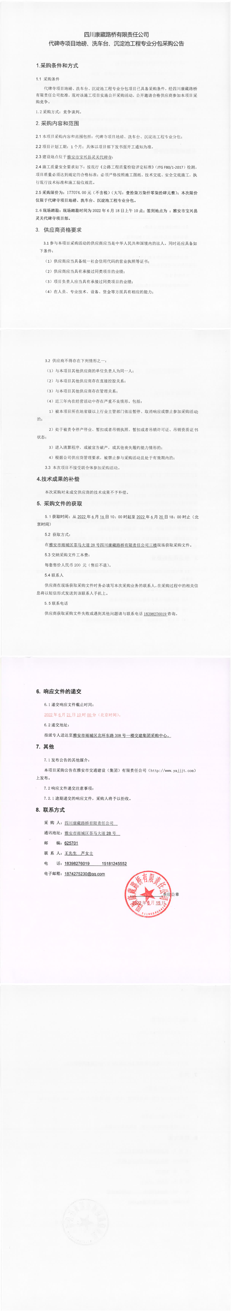 四川康藏路橋有限責(zé)任公司代碑寺項(xiàng)目地磅、洗車臺(tái)、沉淀池工程專業(yè)分包采購公告