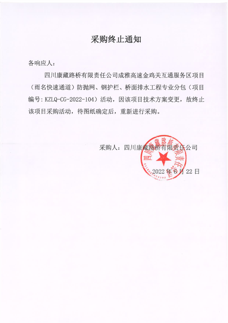 四川康藏路橋有限責任公司成雅高速金雞關(guān)互通服務(wù)區(qū)項目(雨名快速通道)防拋網(wǎng)、鋼護欄、橋面排水工程專業(yè)分包采購終止通知