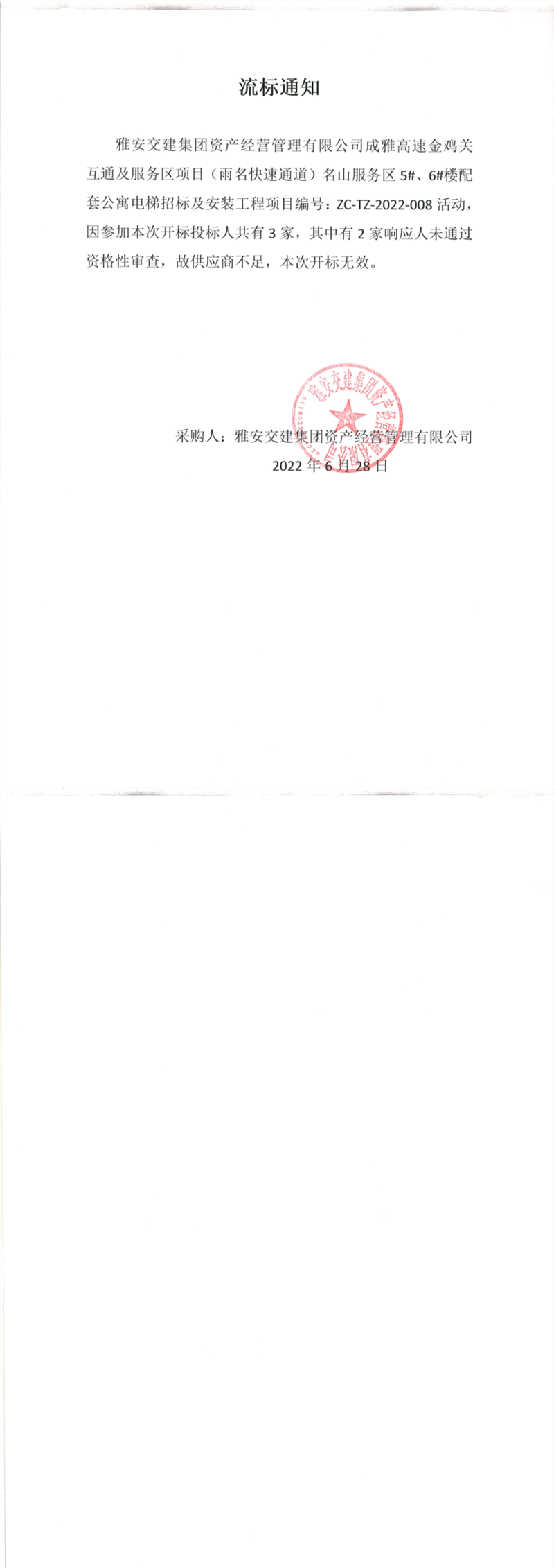 雅安交建集團(tuán)資產(chǎn)經(jīng)營管理有限公司成雅高速金雞關(guān)互通及服務(wù)區(qū)(雨名快速通道)名山服務(wù)區(qū)5#、6#樓配套公寓電梯招標(biāo)及安裝工程項(xiàng)目流標(biāo)通知
