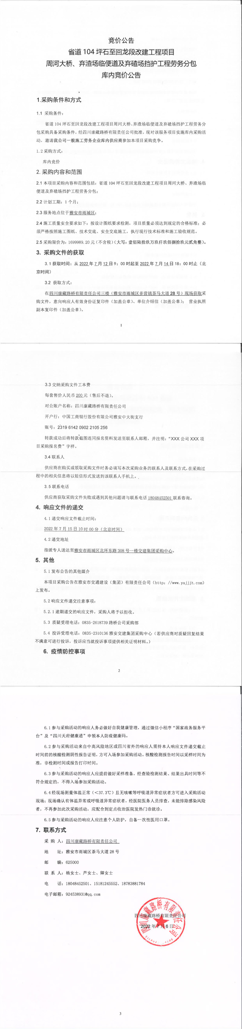 四川康藏路橋有限責任公司省道104坪石至回龍段改建工程項目周河大橋、棄渣場臨便道及棄碴場擋護工程勞務分包庫內(nèi)競價公告