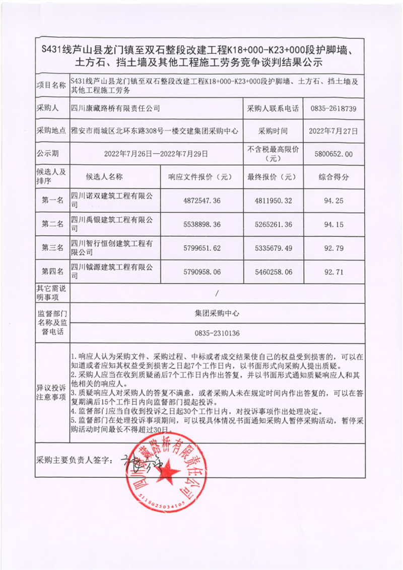 四川康藏路橋有限責(zé)任公司S431線蘆山縣龍門鎮(zhèn)至雙石整段改建工程K18+000-K23+000段護(hù)腳墻、土方石、擋土墻及其他工程施工勞務(wù)競爭談判結(jié)果公示