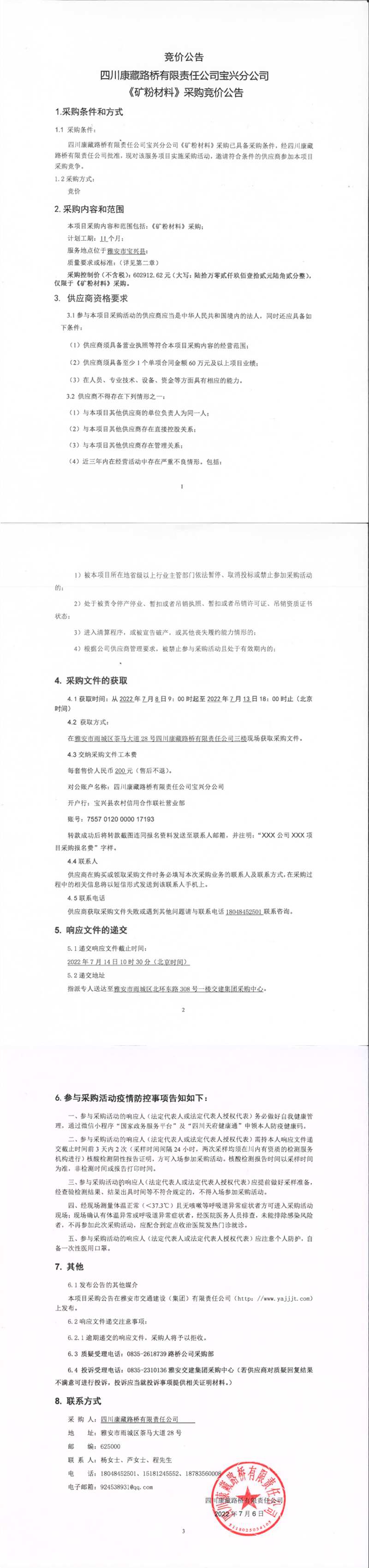 四川康藏路橋有限責(zé)任公司寶興分公司礦粉材料采購競價(jià)公告