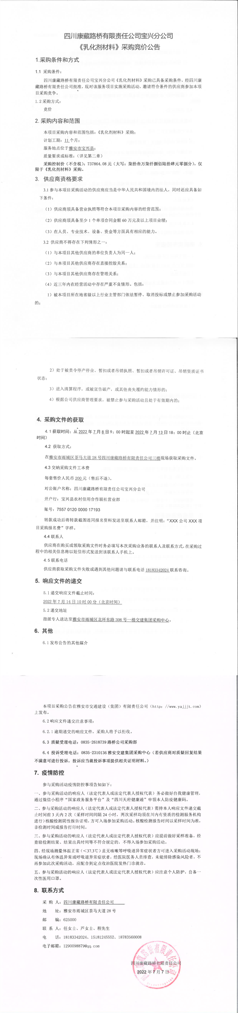 四川康藏路橋有限責(zé)任公司寶興分公司乳化劑材料采購競價公告