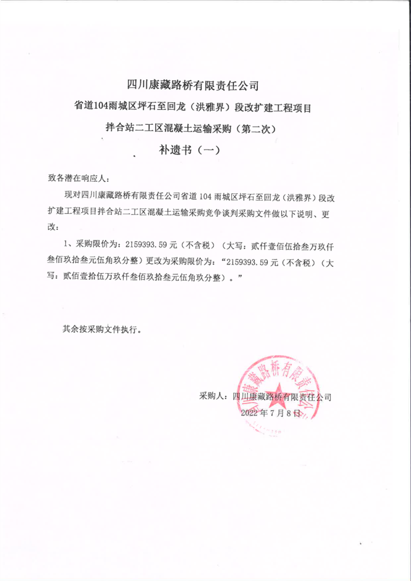 四川康藏路橋有限責(zé)任公司省道104線雨城區(qū)坪石至回龍(洪雅界)段改建工程項(xiàng)目拌合站二工區(qū)混凝土運(yùn)輸采購(gòu)(第二次)補(bǔ)遺書(shū)(一)